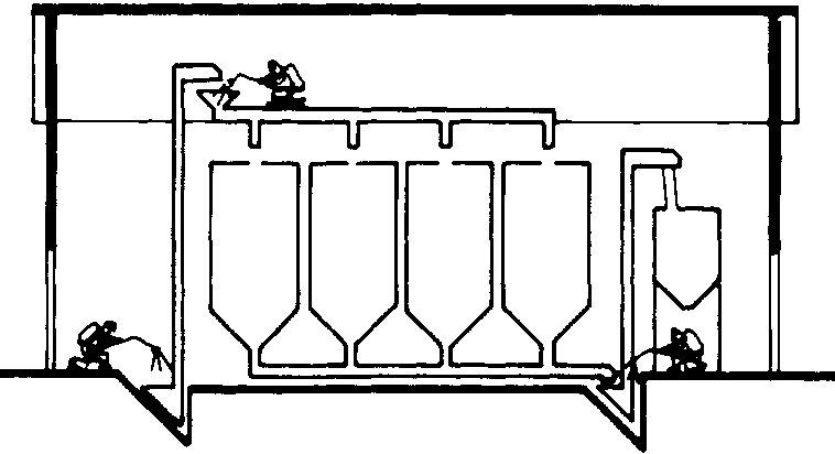 Los segundos tipos de silos, igualmente de chapa o de hormigón, están constituidos por cámaras yuxtapuestas, de planta cuadrada o rectangular, más largas y anchas que altas.