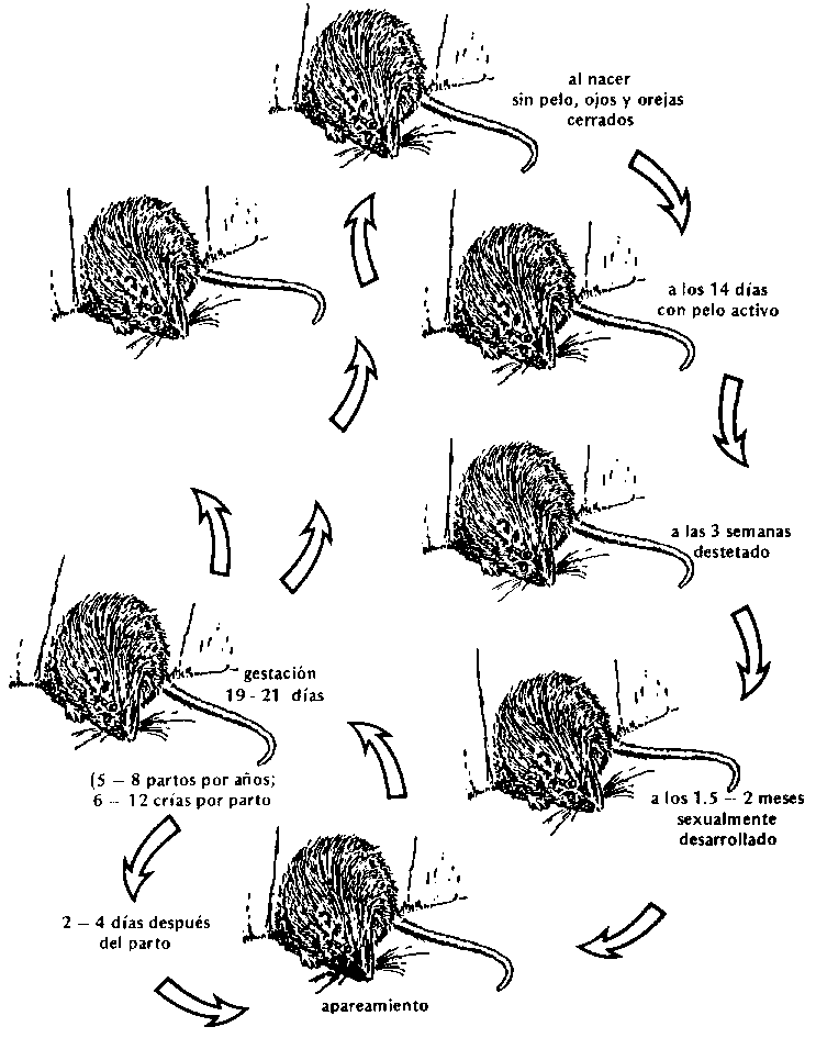El periodo promedio de vida de los roedores es relativamente corto, 1 - 2 años. Se reproducen a los 2 ó 4 meses de edad y probablemente continúan haciéndolo hasta aproximadamente los 18 meses de edad (Figura 10). El número de crías depende de la especie y varía según las condiciones climáticas y alimenticias del lugar. En la Figura 11 se presenta el ciclo de vida del ratón común (Mus musculus). Las demás ratas y ratones tienen un ciclo muy similar.