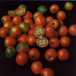 El color del fruto es determinado por la Iycopersicina y carolina, y el amarillo por la xantofila. El aroma está determinado por el contenido de ácidos etéreos. Contiene además caroteno o provitamina A.