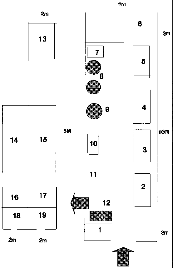 En primer lugar sería muy útil la existencia de un pequeño alero tipo galería, a la entrada de la sala principal, donde se pudiera almacenar en forma temporal la materia prima que fuera llegando a proceso. Este alero serviría para mantener la fruta protegida del sol y además para eliminar aquellas partes de la fruta que no se desea introducir a la sala de proceso por su volumen o por su naturaleza, por ejemplo, la vegetación de la piña, la que se puede cortar afuera inmediatamente antes de entrar a la sala, la que se puede cortar afuera inmediatamente antes de entrar a la sala. Sería deseable que este sector de la planta fuera de piso de cemento, pero en caso de no ser posible se pueda cubrir con tableros de madera adecuados para el fin. Otro recinto adicional es uno destinado a bodega de insumos, por una parte y de productos, por otra. Este recinto que puede ser uno solo dividido en dos mediante un cierre transparente de malla, debiera ser de piso de hormigón y paredes impermeables y ojalá resistentes al calor. En él se deberá guardar perfectamente controlado todo el stock de materiales e insumos para la producción y, por supuesto, los envases de producto debidamente etiquetados. Estas bodeguitas debieran ser de acceso restringido para un mejor control de los materiales.