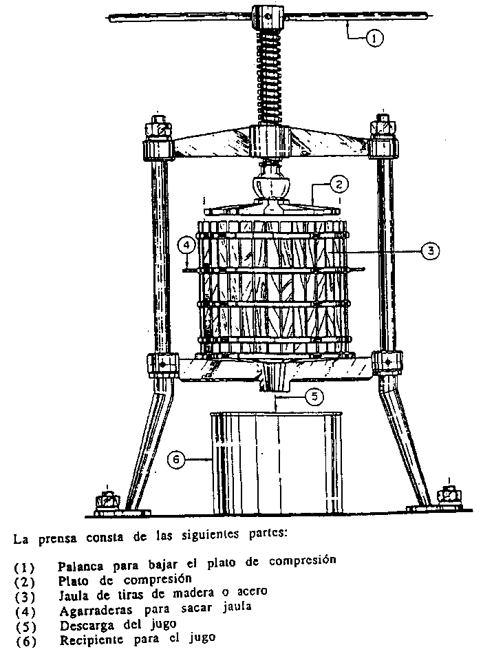 Prensa manual: Esta consiste en una prensa tipo manual para extraer jugos opalescentes o claros de fruta triturada o entera. Basicamente esta compuesta por una superficie superior fija, de metal, en forma de disco, una base en la que se coloca una bandeja y sobre la bandeja va la fruta envuelta en un paño blanco, para prensado, la bandeja y la fruta se colocan en un filtro de metal en forma cilindrica. La base de este filtro se eleva accionando una manilla hasta el punto en que la superficie fija ejerse presión sobre la fruta contenida en el paño, la fruta se muele y el jugo pasa a través de los tamices y cae sobre una bandeja la cual tiene una salida para recibir el jugo.