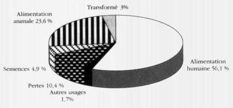 La proportion de RTB directement utilisée en alimentation humaine varie de façon importante en fonction des espèces (de 49% pour les ignames à 85% pour les espèces secondaires; figure 1) et en fonction des régions (de 33% en Europe à 82% en Océanie).