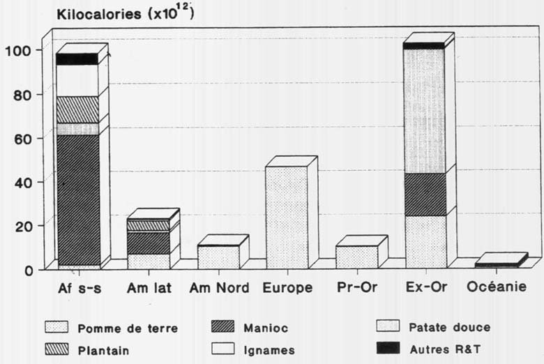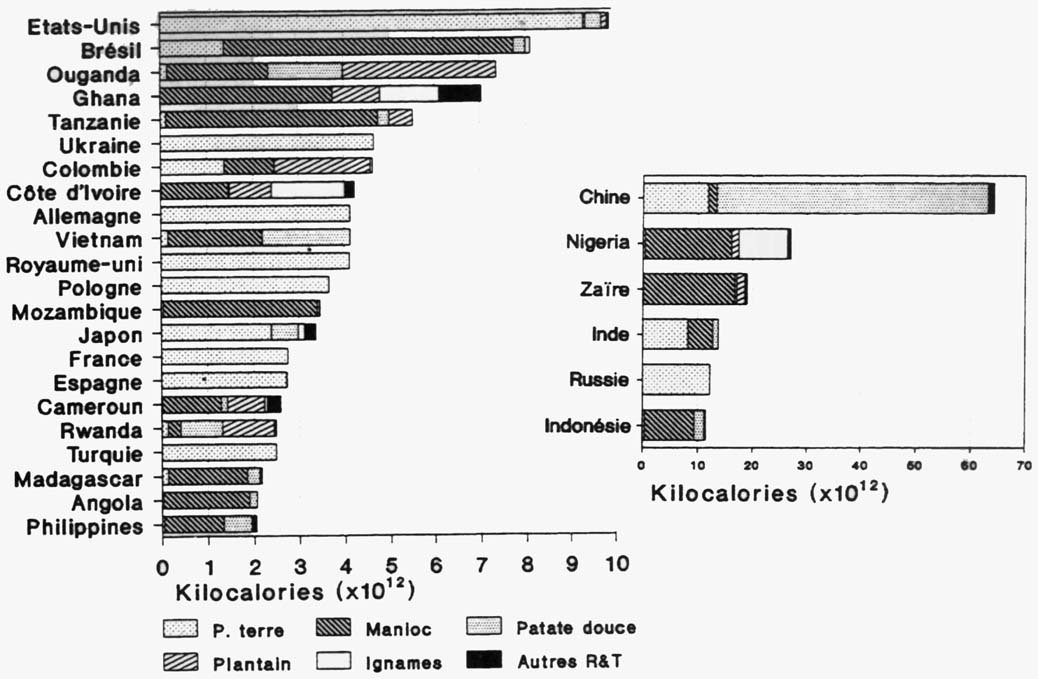 Parmi les 10 pays bénéficiant des plus importantes disponibilités énergétiques alimentaires à partir de chacune des espèces, on relève une majorité de pays européens pour la pomme de terre, de pays africains pour le manioc, le plantain et les ignames et de pays asiatiques pour la patate douce. On peut souligner que 1/3 du manioc directement disponible pour la consommation humaine se situe au Zaïre et au Nigeria, que plus des 3/4 de la patate douce est localisé en Chine, que 1/5 du plantain se trouve en Ouganda et que près de 60% des ignames est consommé au Nigeria.