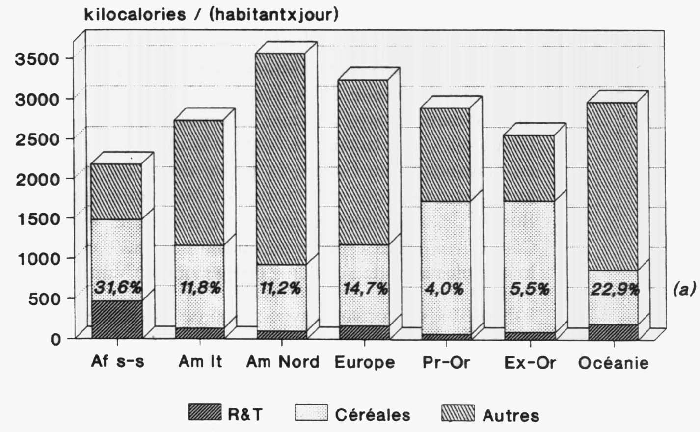 Les RTB utilisés en alimentation humaine ne représentent, à l'échelle mondiale, que 5,4% des DEA totales correspondant à 10,6% des DEA à partir des céréales. Toutefois, compte tenu de leur répartition très inégale, leur importance est, dans certains pays, considérable. Cette importance se manifeste, d'une pari, au niveau des quantités totales d'aliments disponibles et, d'autre part, au niveau de leur contribution aux DEA totales.