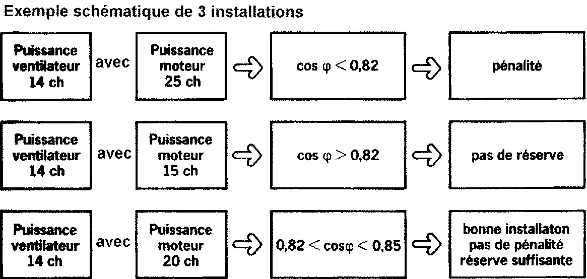 L'élément qui indique la bonne ou mauvaise utilisation du circuit triphasé E.D.F. s'appelle le cosj . Cette valeur, qui ne correspond pas au rapport entre la puissance du ventilateur et la puissance du moteur, ne peut être mesurée que par un spécialiste. Cet élément apparaît sur les plaques moteurs (par exemple cosj =84 correspondant à la valeur maximale obtenue par le moteur} et sur les factures E.D.F. sous forme de puissance réactive réellement consommée et de pénalités correspondantes.