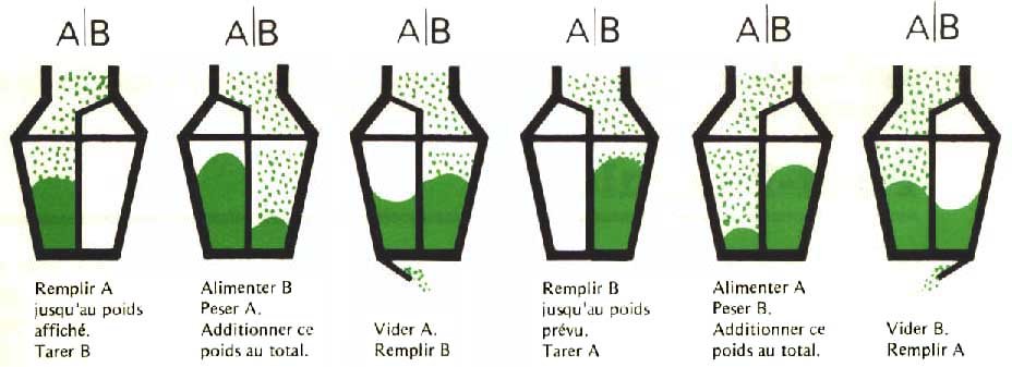 Principe de fonctionnement d'une bascule de circuit a 2 tremies-peseuses (Doc. Technicon Industrie).