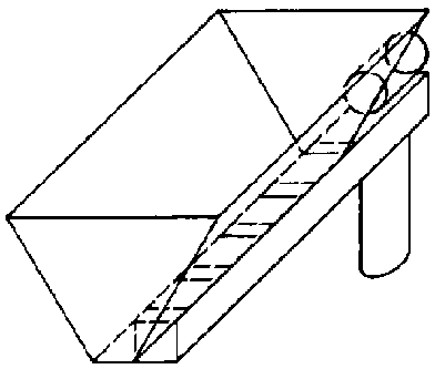 Dans ce cas la trémie a la forme d'un V, le transporteur est situé à la pointe du V. L'alimentation de celui-ci s'effectue par l'intermédiaire de trappes disposées régulièrement sur toute la longueur