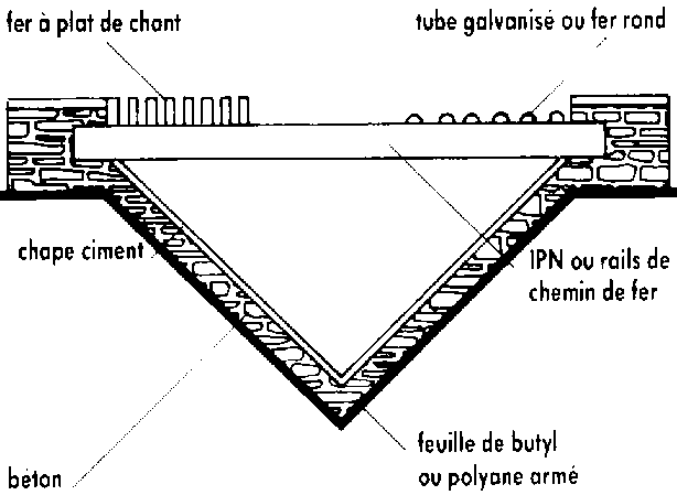 Si les véhicules ne passent pas sur la fosse, une simple armature en cornière de 50 mm ou en IPN de 60 mm, sur laquelle repose du métal déployé, suffit. Dans tous les cas, la couverture doit être conçue de façon à permettre le libre écoulement du grain au cours du déchargement. Il faut, dans le cas d'une armature en IPN, souder des déflecteurs sur les ailes, pour supprimer tous les plans horizontaux; dans le cas de cornières métalliques, positionner ces dernières avec l'arête vers le haut.