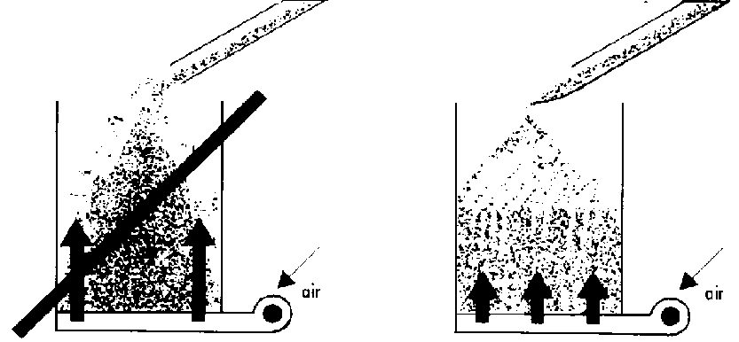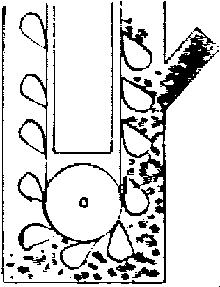 Dans les cas difficiles, où il n'y a pas d'accès et pas de possibilité d'écoulement gravitaire du grain, ni de mise en place de moyens de manutention classiques, il reste le recours au matériel pneumatique. Il s'agit d'une soufflerie servant à aspirer le grain et à le refouler par l'intermédiaire de tuyauteries. Le débit d'un appareil pneumatique diminue d'un tiers lorsqu'il fonctionne à 45" par rapport à l'horizontale et de deux tiers lorsqu'il aspire ou refoule à la verticale. Pour un type d'appareil donné, lorsque ce dernier fonctionne à l'horizontale, son débit baisse de 15 % quand on double la longueur du circuit.
