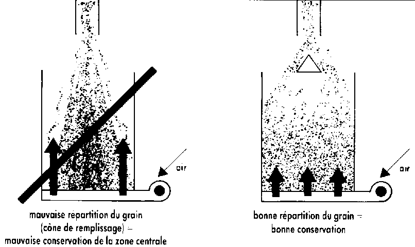Lors du remplissage des cellules le grain subit un choc lors de l'impact sur la paroi verticale ou sur le fond. Si le grain est très sec ou s'il a été maltraité au cours du séchage, le taux de grains cassés augmente avec la formation de « fines » (poussières de farine); ceci est néfaste à une bonne conservation des grains. De même lors du remplissage d'une cellule lorsque l'arrivée du grain s'effectue toujours à partir du même point, il se produit « un cône de remplissage »: c'est une zone où le grain est plus tassé et plus concentré en brisures que le restant de la cellule, et donc la ventilation sera peu efficace, créant ainsi un lieu à risque d'échauffement du grain. Des systèmes simples permettent de réduire ces inconvénients, il s'agit d'une simple tôle fixée au bout du tube de descente du grain qui éclate le flux de grain, ou bien d'un cône pointe en haut placé dans le flot de grain qui éparpille le produit.