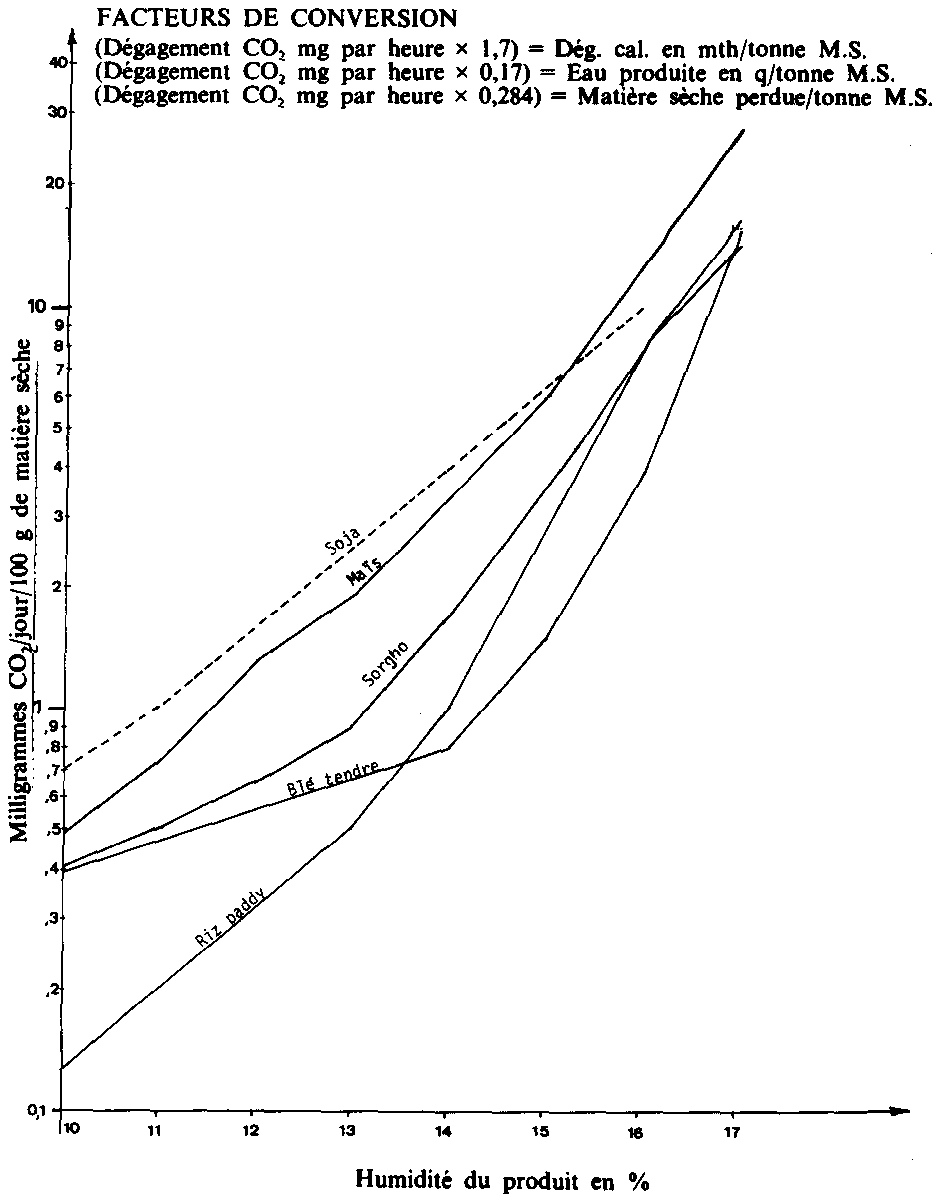La vitesse de dégradation du produit pourra être appréciée de façon précise en laboratoire, en mesurant la quantité de gaz carbonique (CO2) dégagée par 100 grammes de grain (matière sèche) en 24 heures (Fig. 4).