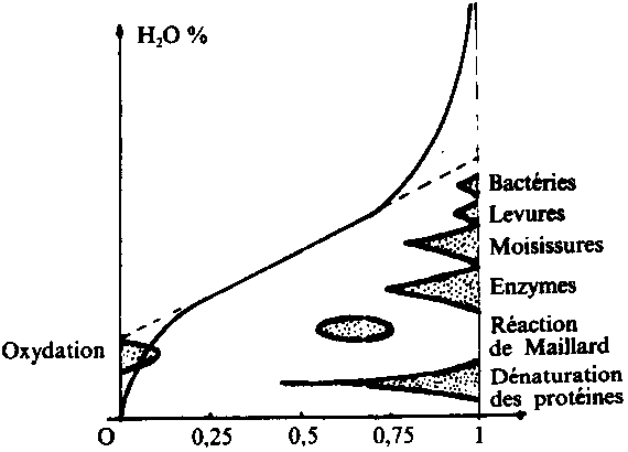Les recherches ont montré que la fraction d'eau comprise entre la courbe d'équilibre et la partie linéaire extrapolée est une eau suffisamment libre pour constituer un milieu de diffusion favorable aux réactions chimiques et enzymatiques, ainsi qu'au développement des micro-organismes (Fig. 6).