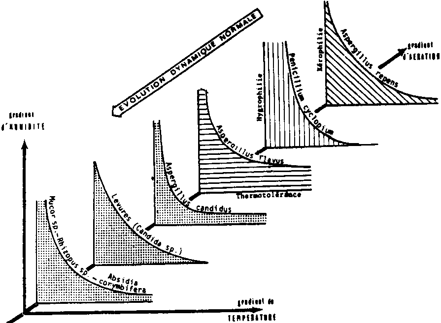 Nous avons vu que le domaine de développement des microorganismes, en fonction de la température, était très vaste: de - 80 C à + 800 C. Pour chacune des espèces de moisissures, il est cependant plus restreint - Ex.: Aspergillus flavus: de 12 à 45° C. L'optimum de développement se situe dans la plupart des cas entre 20° C et 40° C (Aspergillus flavus: 35° C).