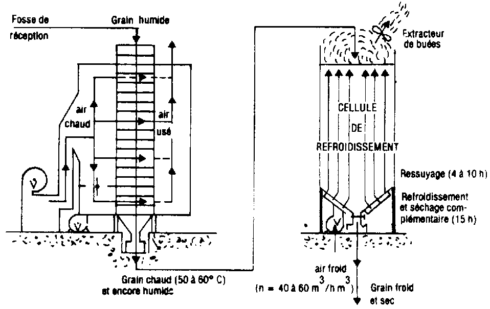 La technique de séchage à courants croisés utilisée dans les séchoirs continus fait que tout au long de son circuit dans le séchoir le grain est attaqué par un air ayant toujours les mêmes caractéristiques. En haut du séchoir, l'air chaud rencontre le grain très humide et ressort pratiquement saturé. Par contre, en bas de la colonne de séchage, le grain étant déjà fortement séché, les transferts d'eau sont beaucoup plus difficiles. Le débit spécifique étant le même, l'air qui ressort est loin de la saturation, donc sa température est encore élevée (60° C environ) et il peut être recyclé.