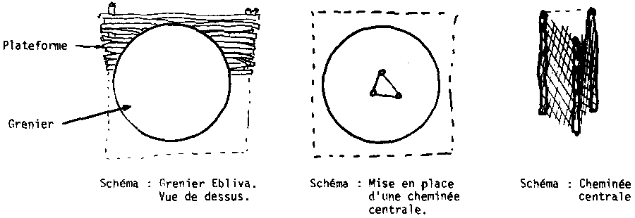 Pour améliorer les circulations d'air il peut être intéressant d'équiper le grenier d'une cheminée centrale d'aération réalisable en matériaux locaux (rondins + branchage) ou en grillage (Fig. 92).