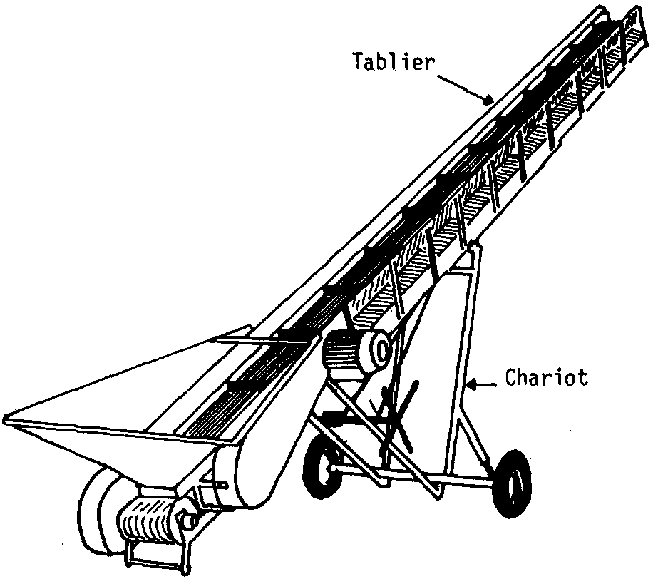 - d'un tablier, ensemble rigide et inclinable de 6 à 10 m de long, supportant, par l'intermédiaire de rouleaux étanches, une bande en caoutchouc de 50 à 60 cru de large, généralement garnie de barrettes transversales, pour transporteur incliné;