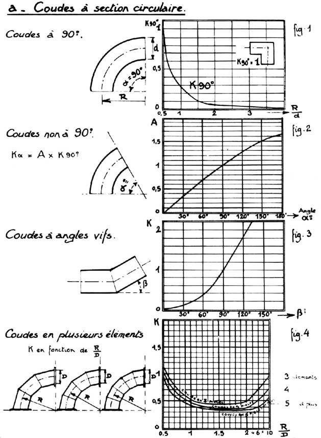 Les graphiques qui suivent permettent de calculer les pertes de charge provoquées par les accidents les plus fréquents des conduites de ventilation, afin de définir le ventilateur nécessaire à l'installation. Ces renseignements complètent le paragraphe 6.2.3. «Notions de base pour le calcul d'une installation de ventilation».