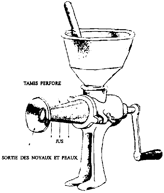 Une vis sans fin est mue à la main pour faire progresser les fruits dans un tunnel de forme conique dont les parois sont perforées. Les fruits sont de plus en plus tassés au cours de leur avancée; selon la dimension des trous, une purée ou un jus s'écoule à travers la grille. au bout du cône, il ne reste plus que les fibres.